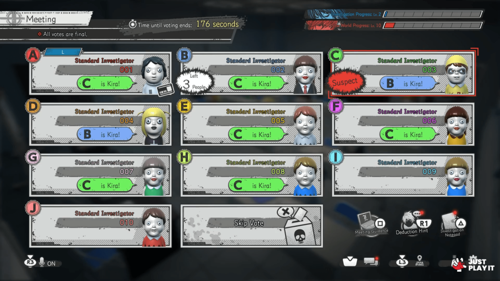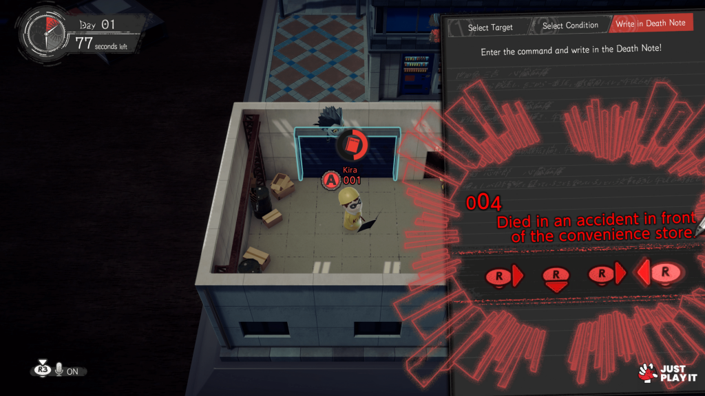 يمكن للاعبين اختيار أحد الأدوار الأربعة: Kira، أو تابع Kira، أو L، أو المحقق، ولكل دور خصائص فريدة تسمح بتطوير استراتيجيات متنوعة بناءً على سيناريوهات اللعبة المتغيرة. كما توفر اللعبة خيارات تخصيص متعددة تشمل تخصيص أسماء اللاعبين وأفاتارات متنوعة بالإضافة إلى مؤثرات خاصة تُعرض في لحظات اللعب الحاسمة. ومع تقدم اللاعبين، يمكنهم فتح المزيد من العناصر مثل لوحات الأسماء، وأكسسوارات متنوعة للشخصيات، وتأثيرات خاصة تعزز التجربة البصرية أثناء اللعب.