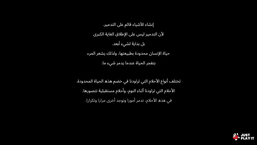 اللعبة تدعم الترجمة العربية الكاملة للقوائم والحوارات، مع حرص واضح على استخدام مصطلحات دقيقة تتناسب مع طابعها الفلسفي والتجريبي. هذا التعريب يسهم في جعل التجربة أكثر قربًا وسهولة للاعب العربي دون فقدان الجو الغامض والرمزي الذي تتميز به اللعبة.