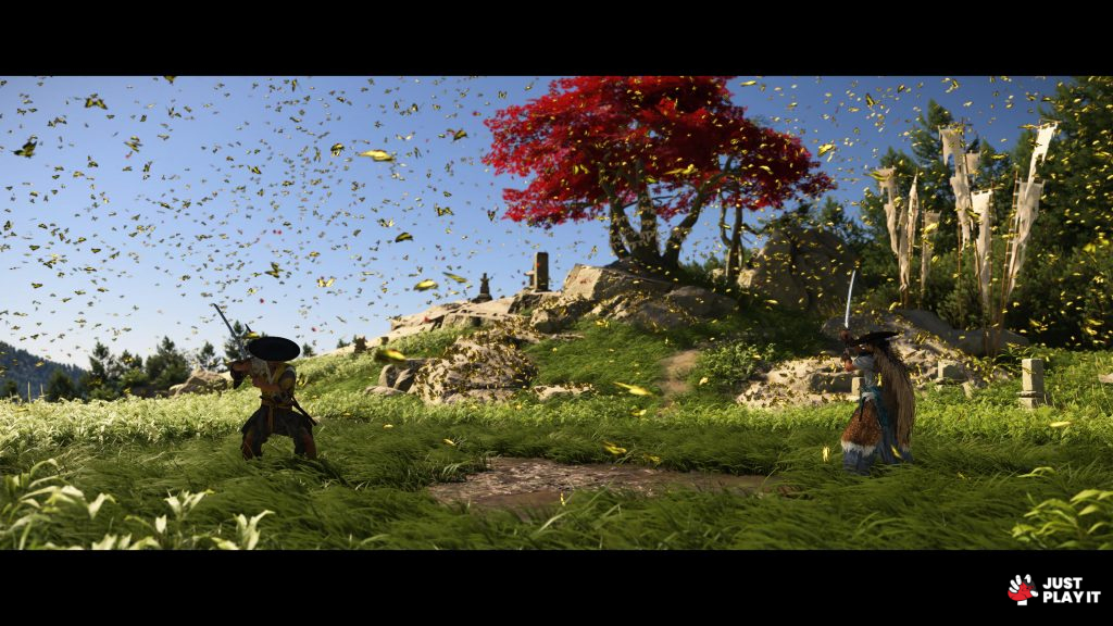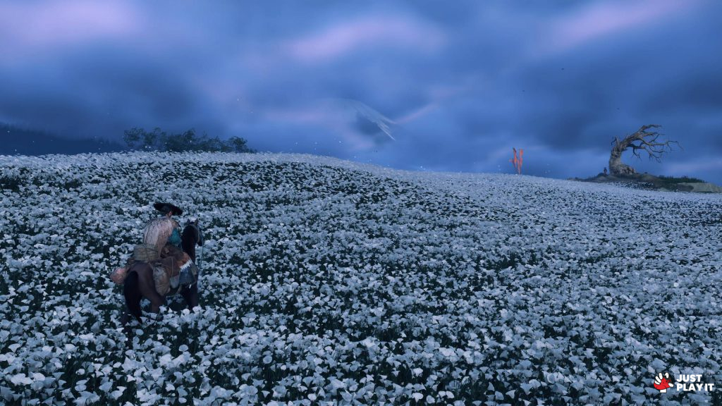 مررت بطريقي على قطعان من الأحصنة والغزلان و طيور بمختلف الأنواع، أيضا فراشات حمراء و يرقات برتقالية وورود ملونة بين الازرق و الاصفر و الاخضر و الاحمر والبنفسجي، عالم حي نابع بالالوان، يجعل من Ghost of Yotei إحدى أجمل الالعاب بصريا و فنيًا.