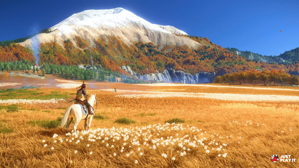 لعبة Ghost of Yotei هي عبارة عن لوحة فنية تُمتع العيون، فمع كل رحلة قصيرة خضتها من نقطة إلى أخرى، أجبرني عالمها الفاتن على التوقف والتأمل ولو لوهلة، توقفت كثيرا و التقطت صورًا كثيرة لجمال عالم إيزو، من بيئته المخضرة و الثلوج التي تغطي جبل يوتيه، مع أشجاره الملونة بالأبيض الناصع و الأصفر العسلي و الأحمر الرامز للينابيع الساخنة.