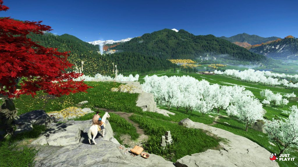 مررت بطريقي على قطعان من الأحصنة والغزلان و طيور بمختلف الأنواع، أيضا فراشات حمراء و يرقات برتقالية وورود ملونة بين الازرق و الاصفر و الاخضر و الاحمر والبنفسجي، عالم حي نابع بالالوان، يجعل من Ghost of Yotei إحدى أجمل الالعاب بصريا و فنيًا.
