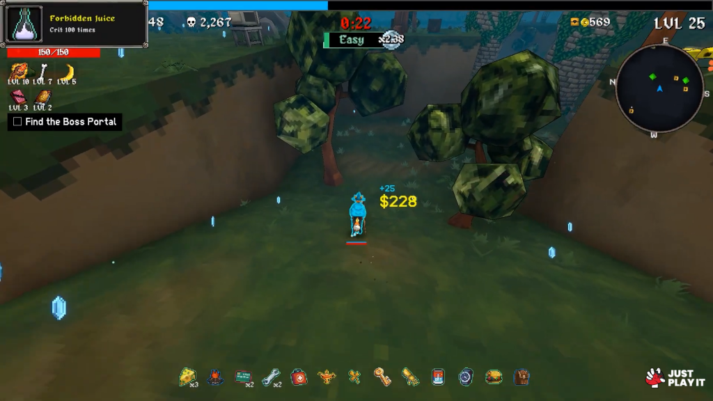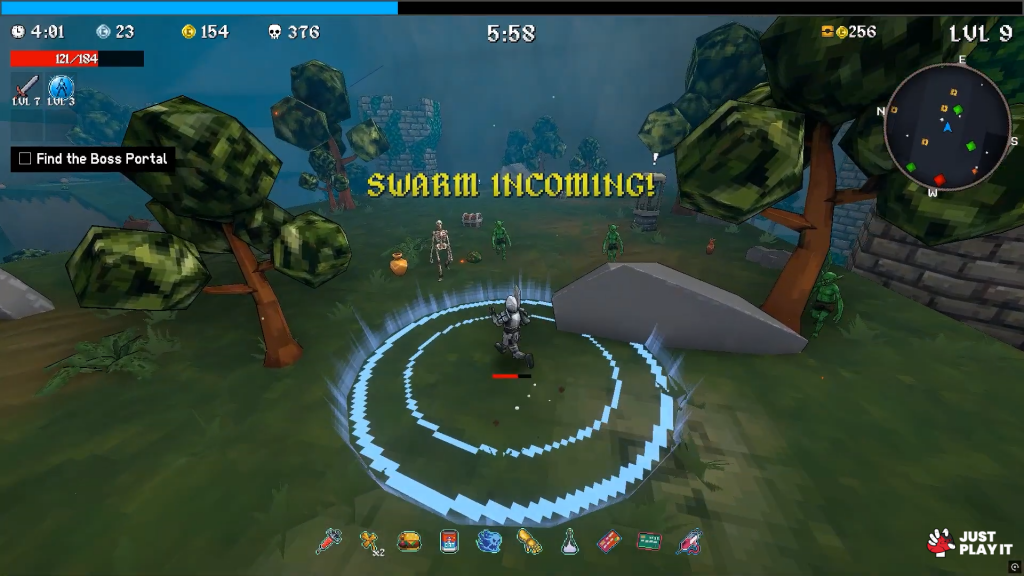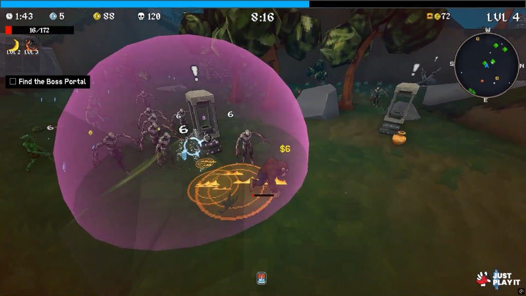 تُلقي بك اللعبة في ساحة قتال عشوائية ضد موجات متتابعة من الوحوش التي تأتي من كل صوب. لديك 10 دقائق فقط قبل أن تضطر إلى مواجهة الزعيم أو أن تُغرقك موجات أعداء قوية لا ترحم. هنا يدخل عامل التوتر والتخطيط في كل ثانية، يشبه إلى حدٍ ما ما رأيناه في Risk of Rain 2.