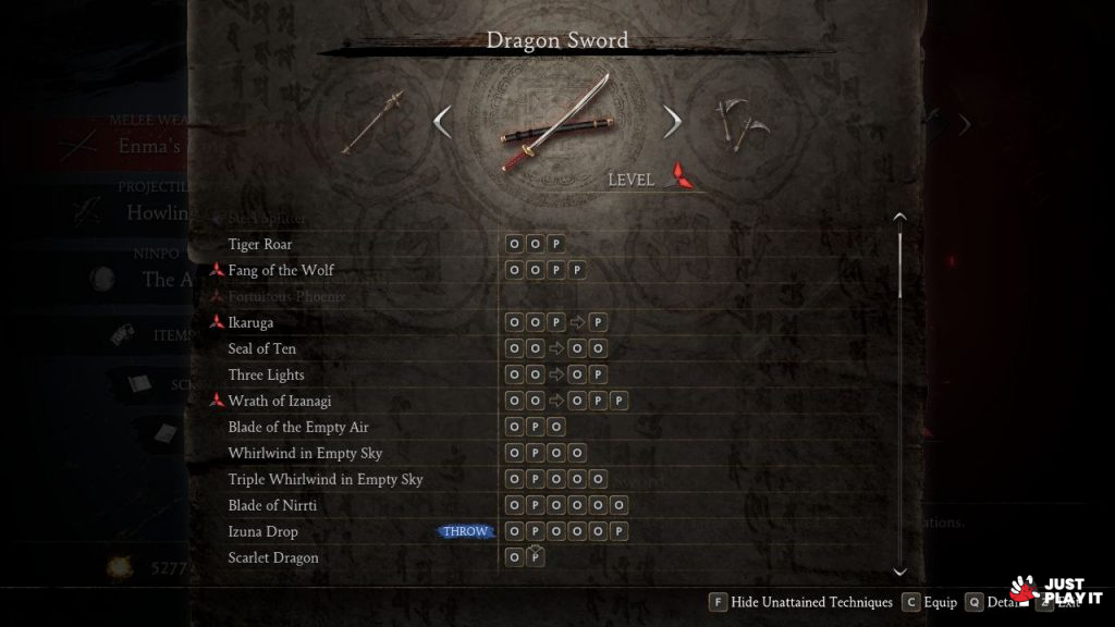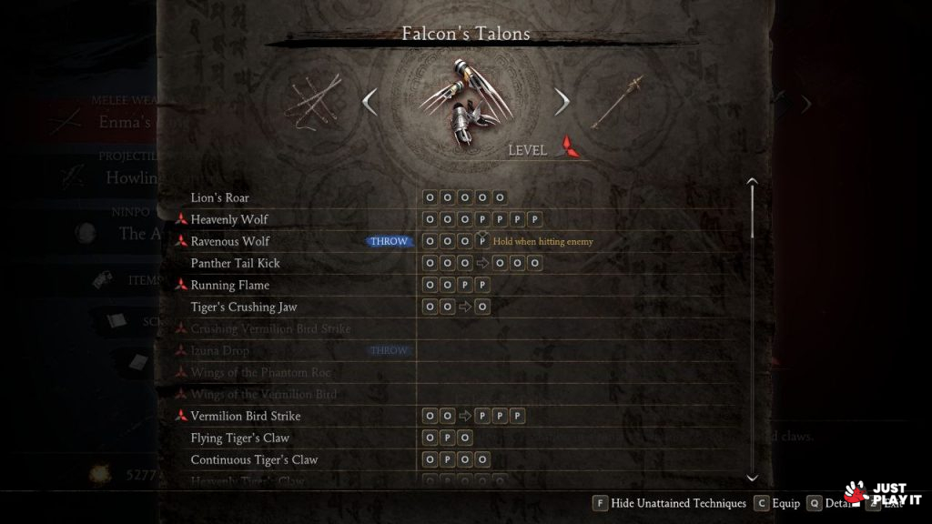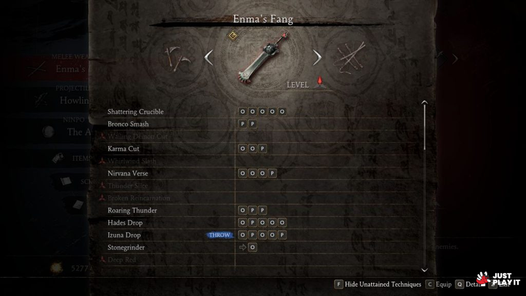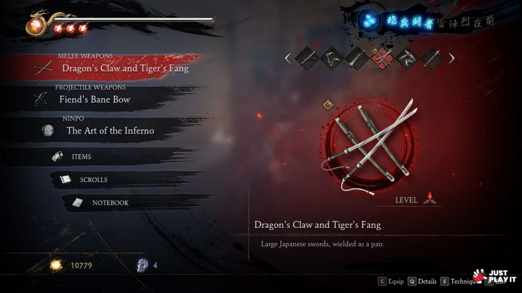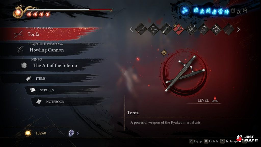 تقدم اللعبة مجموعة كبيرة من الاسلحة الخاصة بالنينجا، حيث يمتاز كل سلاح بنمط قتالي معين، حيث يمكن للاعب إستعمال جميع هذه الاسلحة كيفما يشاء و في جميع الاوقات، فكل ما عليه فعله هو التغيير بينها اثناء القتال، وذلك حسب طبيعة القتال الذي يخوضه، بالاضافة الى عدد ضخم من ”الكومبوهات“ التي تجعل من تجربة القتال أكثر تنوعا و متعة، كما يمكن للاعب التفاعل مع الطبيعة المحيطة به لتشكيل حركات قتالية رائعة.