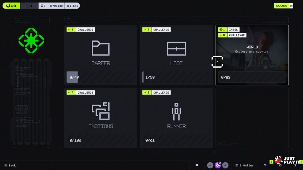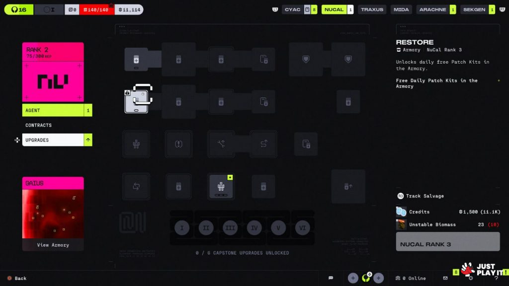 هناك بالطبع قدرات خاصة يمكن ترقيتها عند فصائل أخرى، كالحصول على شحنات درع يوميًا في المستودع، أو تقليل ضرر السقوط من أماكن مرتفعة، أو رفع سرعة استعادة الصحة أو الدرع، أو زيادة ضرر القتال القريب بنسبة معينة وغيرها، هذه الترقيات جعلتني في كثير من الأحيان أركز اهتمامي على العناصر المطلوب مني جمعها، على سبيل المثال : لزيادة سرعة التعافي علي جمع 750 عملة بالإضافة إلى 19 عنصر من Unstable Siomass، وهذه العناصر يمكنك إيجادها في أماكن محددة من الخريطة فقط وليس في أي مكان، أو يمكنك جمعها من الـ Runners الآخرين في حال قضيت عليهم و كانوا يمتلكون هذه العناصر في جعبتهم.