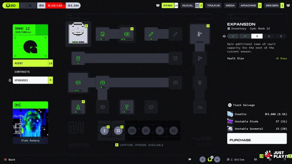 عند إنهائك لمجموعة من العقود و خروجك حيًا مع عدد من الموارد، ستتمكن من ترقية بعض العناصر والقدرات، طبعًا تختلف الترقيات اختلافًا ملحوظا بين كل فصيلة و أخرى، نعم كل فصيلة من الفصائل الستة التي تزودك بالمهام تمنحك ترقيات حصرية، فمثلا قد تجد فصيلة تمنحك إمكانية لشراء بعض الأسلحة مباشرةً بدل تجميعها من الخرائط، فصيلة أخرى تمنحك القدرة على شراء بعض العناصر بدلا من البحث عنها وتجميعها باستمرار، كل الأساس في الترقيات الهامة، مثلا قد تطلب منك الفصيلة الأولى عناصر معينة ستحتاج إلى تجميعها مع قدر معين من المال حتى تتمكن من ترقية مخزونك الذي قد لا يتمكن من استيعاب كل العناصر التي تمتلكها، فكم من عنصر اضطررت إلى التخلص منه أو بيعه فقط لتوفير مساحة جديدة في المخزون، ما جعلني مضطرًا إلى التركيز على هذه الترقية.