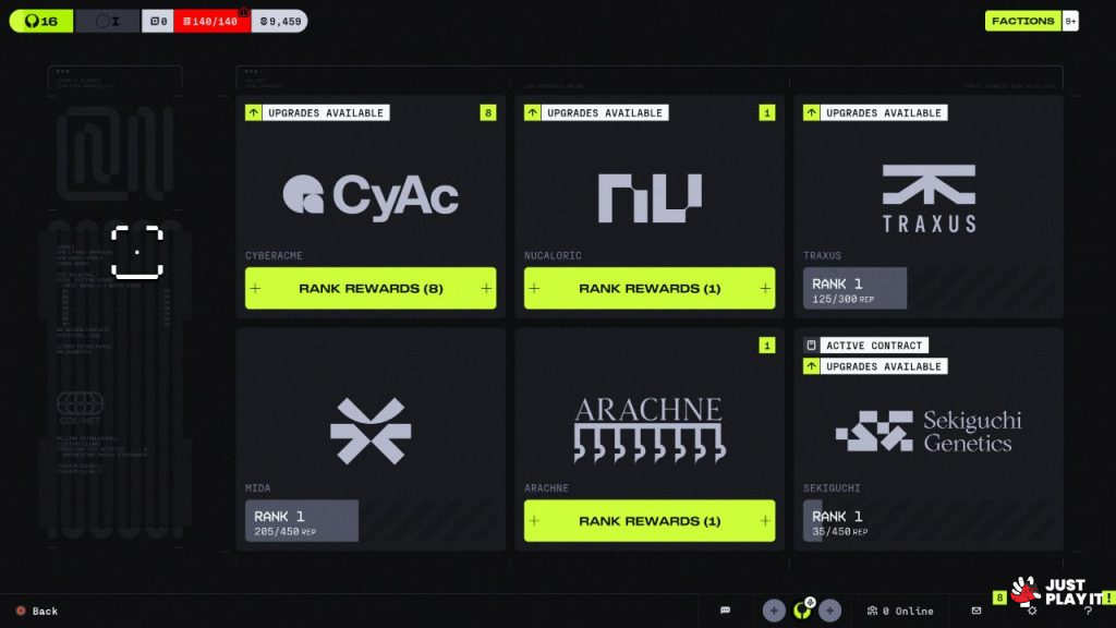ستبدأ مهامك مع فصيلة – شركة – CyberAcme التي ستكلفك بجملة من العقود أي المهام التي عليك إنجازها، وكلما تقدمت كلما تواصلت معك فصائل أكثر لتقدم لك عروضًا مختلفة، وطبعا كلما أنجزت عقودًا لشركة معينة كلما كافأتك هذه الشركة بترقيات حصرية، بحيث هناك لا تمنحك إياها الشركات الأخرى، حيث سيكون هذا عنصرًا هامًا في تحديد أولويات العقود التي ستنجزها والموارد التي ستحصدها، لكن سنتطرق لهذه النقطة أكثر عند الحديث عن أسلوب اللعب.